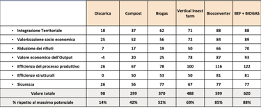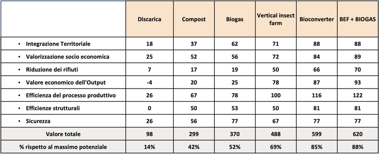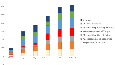 Tra i due processi di bioconversione confrontati, è da evidenziare come il sistema modulare di piccola taglia sia da preferire alle vertical farm perché rende possibile ridurre in maniera significativa i consumi energetici per la gestione del microclima, del riscaldamento invernale e raffrescamento estivo.