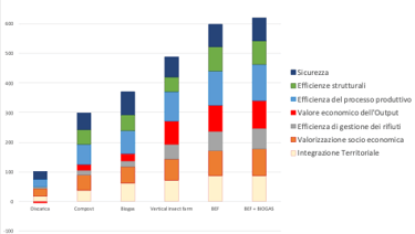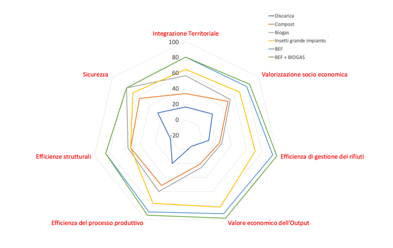 Per una valutazione preliminare dell’impatto della proposta industriale, nel 2021 avevamo condotto un’analisi comparativa delle prestazioni di sostenibilità ambientale, territoriale, socio-economica e sanitaria del processo di allevamento di insetti, mettendolo a confronto con altre modalità di smaltimento e valorizzazione dei rifiuti.
