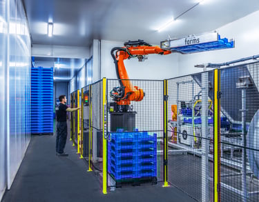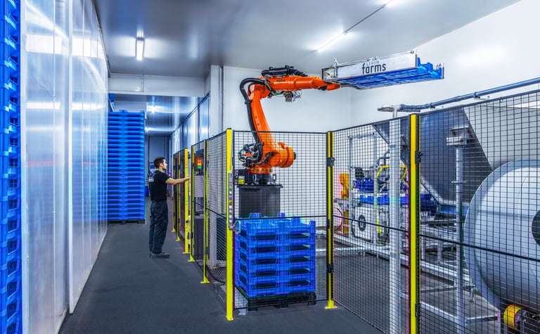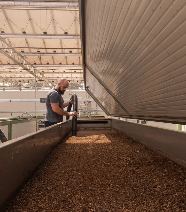 Il carico e lo scarico delle cassette sono gestiti da bracci robotizzati, mentre la preparazione del feedstock si avvale di impianti di triturazione e miscelazione derivati dalle tecnologie già impiegate nell’alimentazione dei suini e degli avicoli.